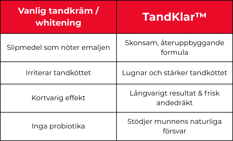 "TandKlar använder probiotika och mineraler för att varsamt bleka, stärka tandköttet och fräscha upp andedräkten – helt naturligt."